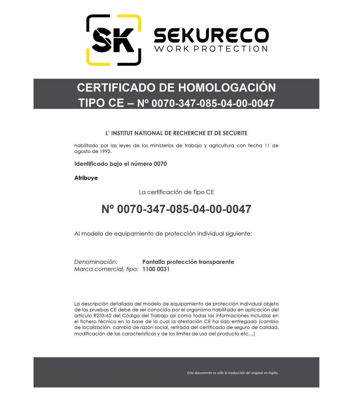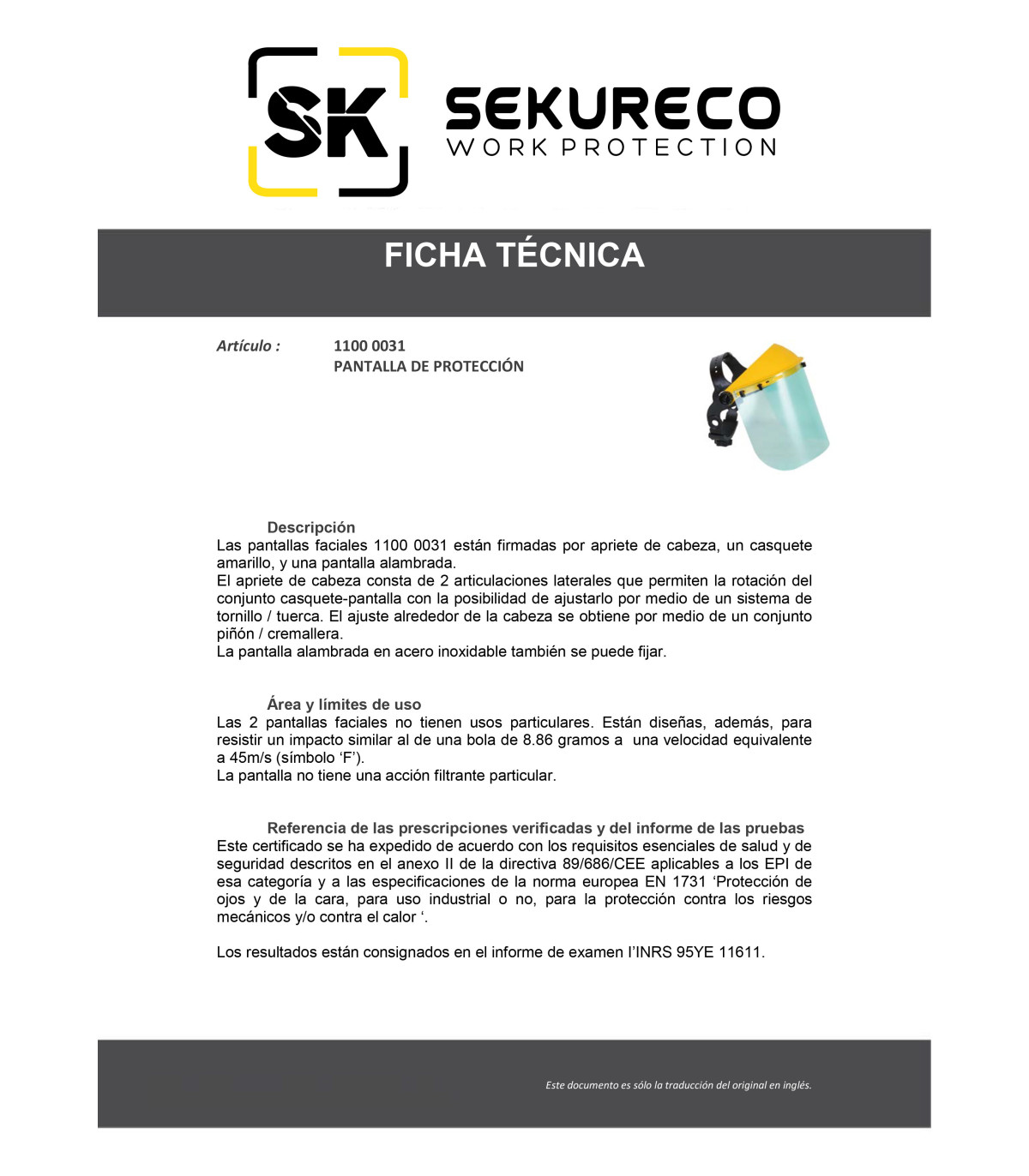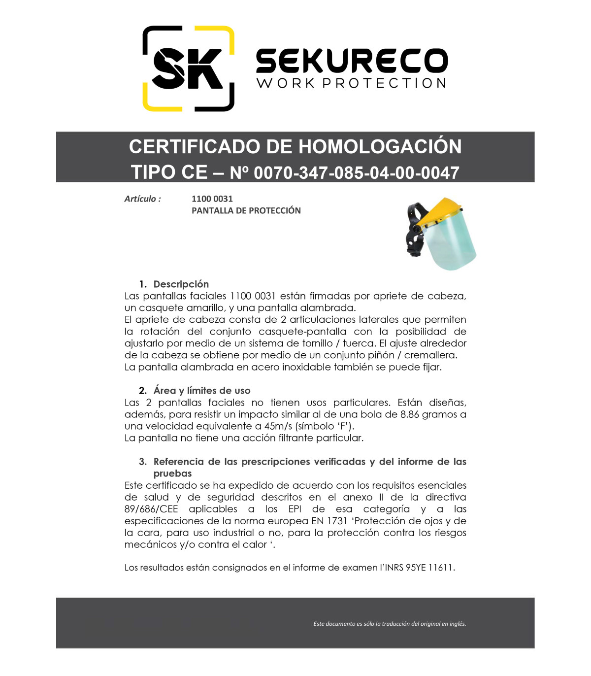 Dieses Zertifikat wurde gemäß den wesentlichen Gesundheits- und Sicherheitsanforderungen erteilt, die in Anhang II der Richtlinie 89/686 / EWG der EPI der EPI der Kategorie dieser Kategorie und den Angaben des Europäischen Standards 1731 "Augenschutz und das Gesicht, für den industriellen Einsatz oder nicht für den Schutz vor mechanischen Angaben, anwendbar sind und / oder gegen Wärmerisiken '.