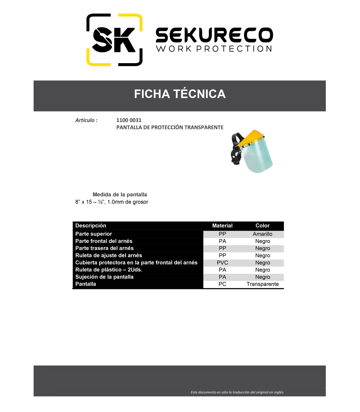 Die Gesichtsschirme 1100 0031 sind durch das Anziehen des Kopfes, einer gelben Kappe und eines kabelgebundenen Bildschirms unterzeichnet.