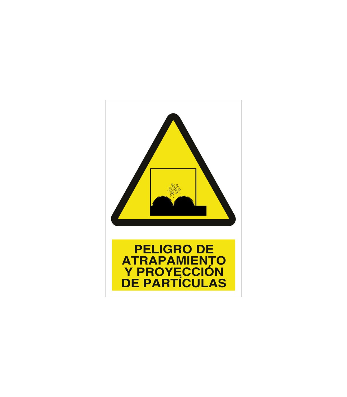 Señal de advertencia que indica el mensaje "Peligro de atrapamiento y proyección de partículas" COFAN. El cartel consta de texto y pictograma alusivo al mensaje de peligro. Tanto el texto como el pictograma forman un claro mensaje visual que destaca por su color amarillo de fondo. El cartel muestra el pictograma en un espacio triangular y el texto en un fondo rectangular amarillo.