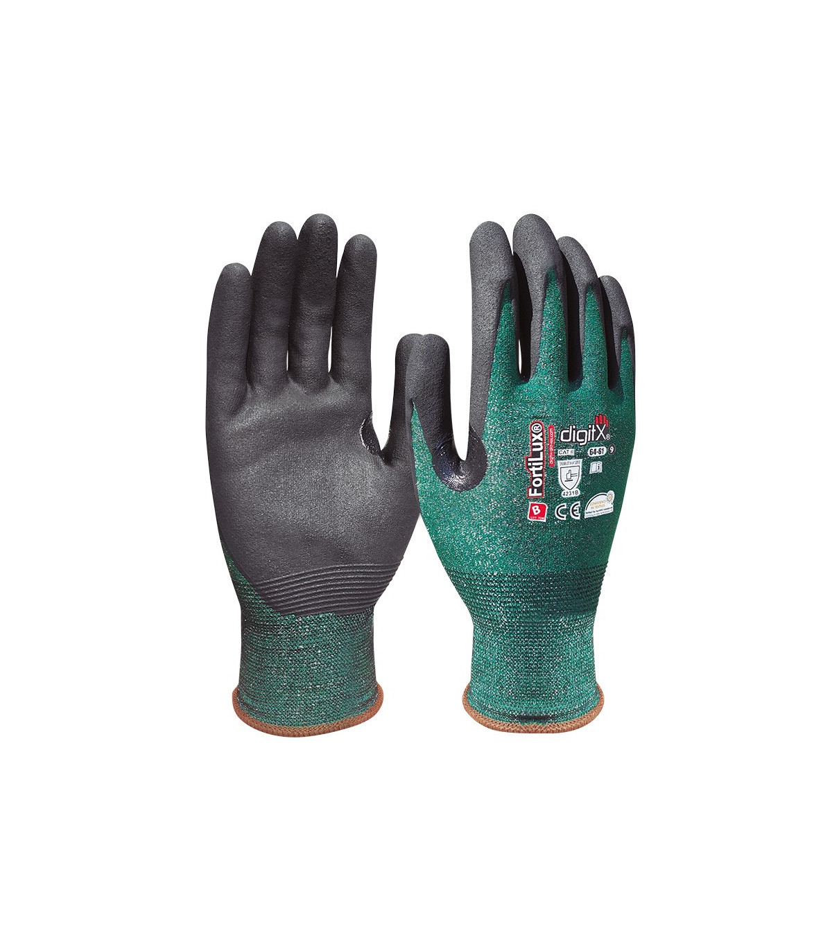 FortiLux, anti-cut B nitrile foam 18G, with thumb reinforcement.