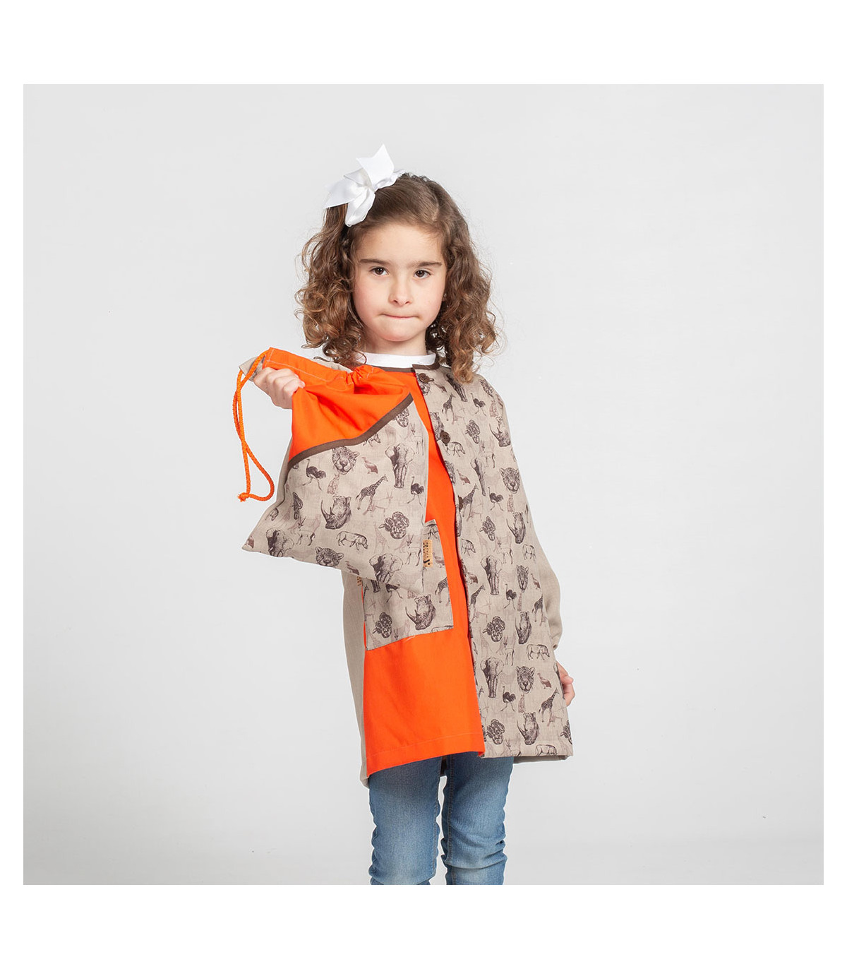 Bolsa de Sabana com estampagem animal em tecido reciclado de cor de areia UNIFORMES GARY'S 360012. Com medidas aproximadas de 29 cm x 21 cm, este saco é espaçoso o suficiente para transportar seus pertences pessoais, tais como lanches, pequenos objetos ou até mesmo itens escolares. Seu tamanho o torna adequado para uma ampla variedade de situações.