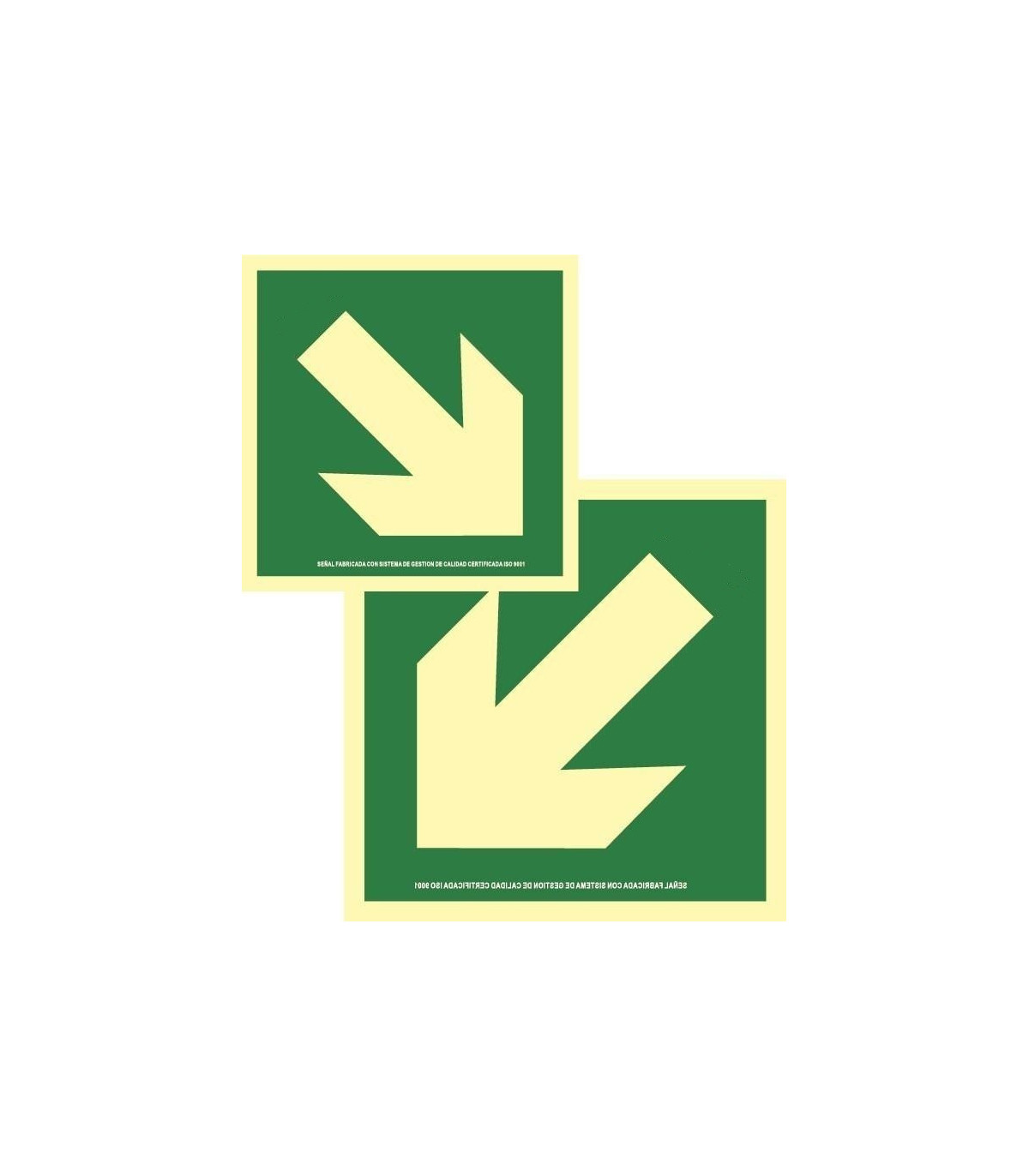 Sinal de evacuação direita em alumínio Classe A SEKURECO. É um sinal de emergência e evacuação forte e fácil de instalar. O sinal é feito com camada de pigmento fotoluminiscente, (depois de absorver a luz, o produto emite-o no escuro, por isso não precisa de qualquer fonte elétrica e o produto pode ser carregado um número indefinido de vezes).